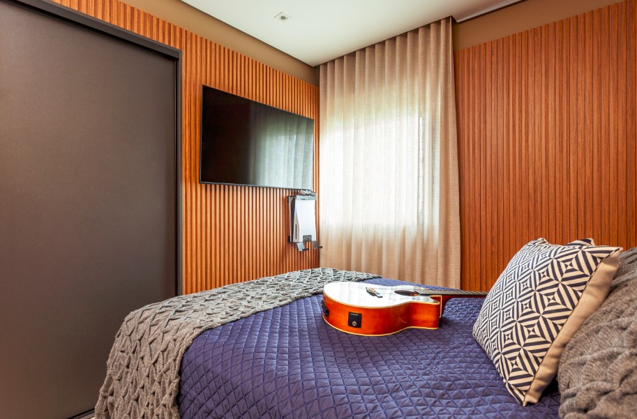 O quarto do filho de Juliana, Diego, um jovem alto, apresentava um desafio: a cama era pequena e não atendia mais às suas necessidades. A arquiteta encontrou a solução ideal: uma cama sob medida com 2,10m de comprimento. Além disso, foi criado um armário embutido na parede, com nichos amplos e espaçosos, para armazenar todos os pertences de Diego.