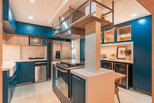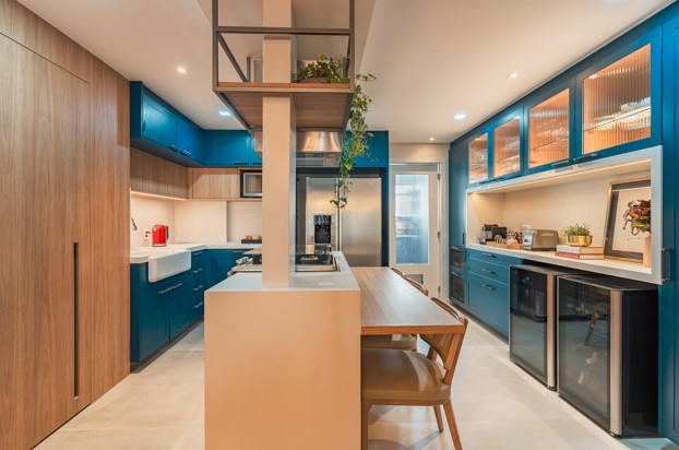 Outra atração da cozinha é a bancada de refeições rápidas, elaborada com um tampo de madeira e combinada com a ilha que exalta os traços nobres e resistentes do Silestone. “A moradora tem um lado romântico, que também se conecta com o contemporâneo. Por isso, misturamos as portas e gavetas almofadadas azuis com a cuba de louça de porcelana e outros materiais como o vidro canelado e a serralheria, que faz uma alusão ao décor industrial”, explica a Ana sobre o conceito que imergiu na construção do espaço.