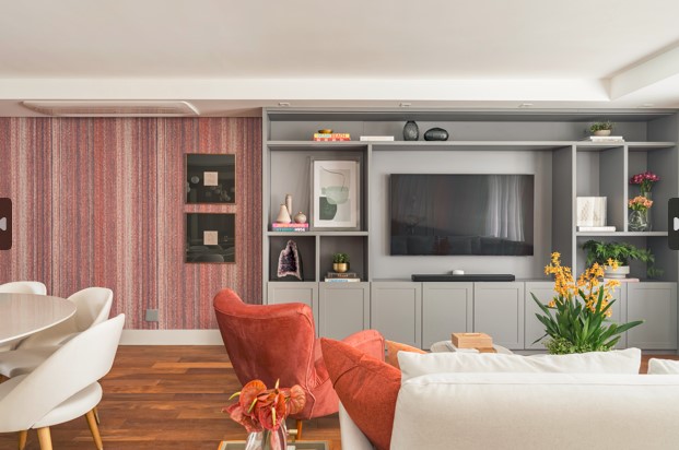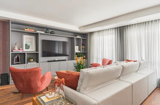Na reforma, a sala de estar ganhou uma estante, executada pela SCA Jardim Europa e desenhada pela Spaço Interior, e que foi composta por armários sem puxadores aparentes, bem como o espaço para a TV e nichos assimétricos para os objetos decorativos. Executado em laca, o design do móvel ressalta leveza e modernidade.