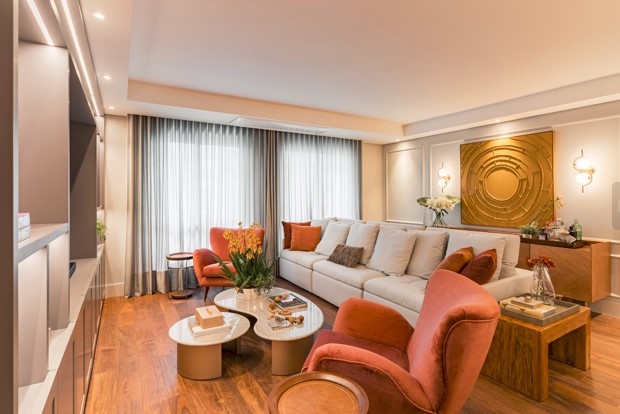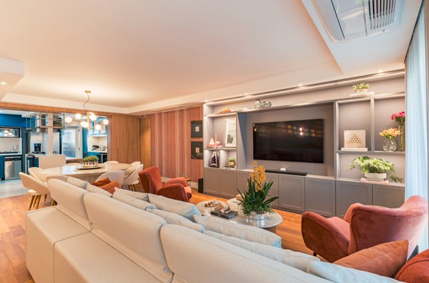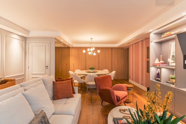 No piso, foi necessária a substituição do revestimento anterior, que deu espaço para a madeira que envolve todo o living, deixando a área social mais convidativa para o dia a dia dos moradores e as ocasiões especiais promovidas por eles.