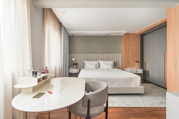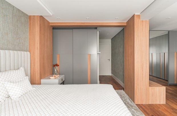 Outro elemento da planta antiga direcionou a criação de um cenário interessante: o pilar serviu de ponto de partida para a marcenaria no dormitório! Para conquistar uma suíte bem generosa foi necessário reformular a planta, que com a nova leitura conectou dois ambientes em apenas um. O elemento estrutural que poderia ser considerado um inconveniente, uma vez que não pode ser removido, foi valorizado com o revestimento de madeira que demarcou a passagem para o closet do casal.