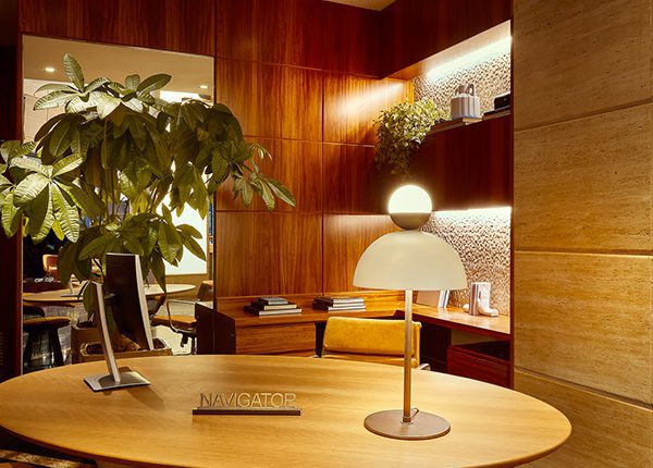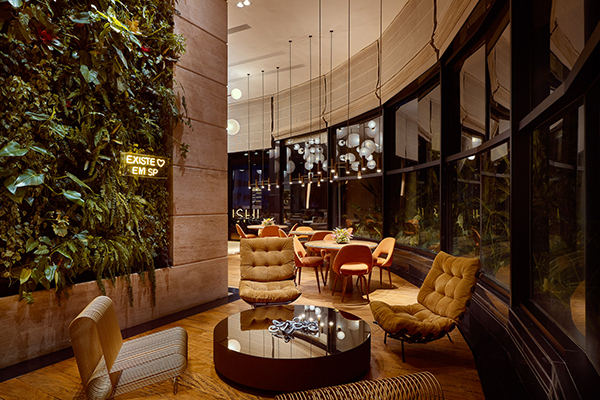 O ponto central do projeto do lobby é a área do Living Lounge Bar & Sushi. Sobre esse lounge há uma grande luminária desenhada para criar uma atmosfera única sob o amplo pé direito de seis metros. Composta por mais de 40 esferas de fibra de vidro fixas a uma estrutura metálica, a peça foi desenhada pela arquiteta Flávia Romi e executada pelo cenógrafo Carlos Rossi. O lounge também é composto por um grande sofá modular que funciona como uma ilha central e organiza o espaço de forma fluída e integrada. Junto dele, há diversos móveis de design assinado, como a poltrona Platner e a mesa Carretel. Já o espaço do lounge de espera foi repensado como uma caixa inserida no grande volume do hall de entrada do hotel. Com pé direito mais baixo, o ambiente foi projetado para ser intimista e acolhedor. Sua estante metálica, de desenho assimétrico, traz brilho e remete a sofisticação da moda na cidade, e com as peças do Ateliê Manos dão o toque final do espaço.