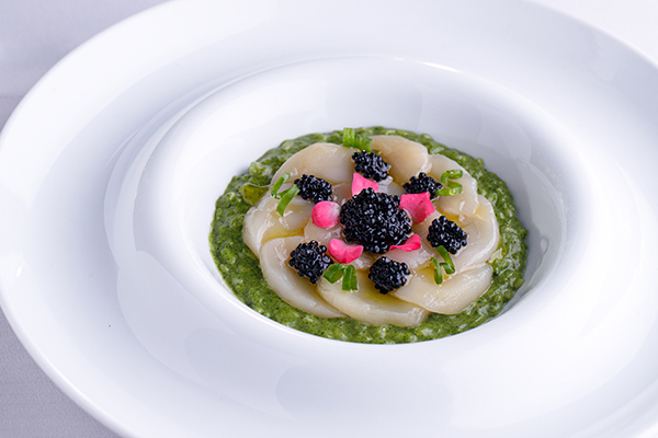 Risoto de pistache com crudo de viera e caviar de Mujol
