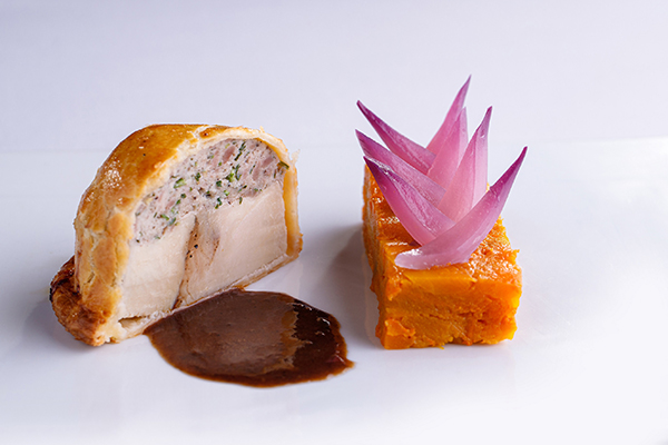 Pithivier de peru com abóbora glaceada e molho de trufa