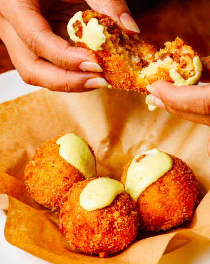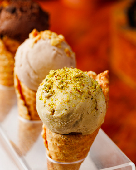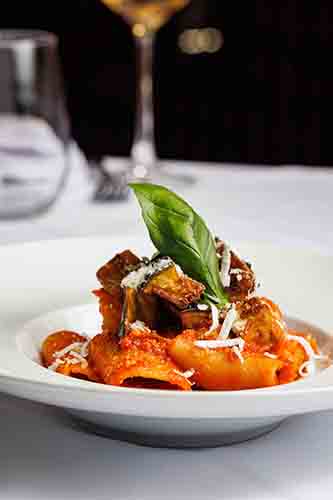 De antipasto, são servidos arancine sicule, os apreciados bolinhos de risoto e aqui recheados com ragu misto e servidos com molho branco aioli e queijo parmesão. Segue com o paccheri alla Norma: massa grano duro ao molho pomodoro com berinjela e ricota fresca (foto). O prato principal é o gamberoni corleone, com camarões envoltos em massa crocante sobre mascarpone e geléia de amarena (foto). Para finalizar, uma trilogia di gelato nos sabores avelã, pistache e chocolate em casquinha artesanal e dispostos em estrutura de acrílico, para uma degustação ainda mais prazerosa.