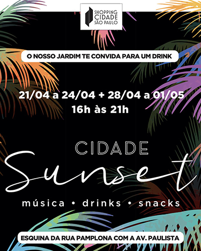 Aberto ao público nos fins de semana estendidos dos dias 21 a 24 de abril e de 28 de abril a 1º de maio, sempre das 16h às 21h. O Cidade Sunset pode ser acessado gratuitamente tanto pela Avenida Paulista quanto pela Rua Pamplona, e conta com um cardápio composto por drinks que caíram no gosto popular e viralizaram nas redes sociais nos últimos tempos, como a gin tônica com especiarias (R$ 29,00) e o moscow mule (R$25,00); além de aperitivos deliciosos para agradar todos os paladares, como porções de dadinho de tapioca (R$ 32,00) e de mini pastéis (R$ 28,00), entre outros.