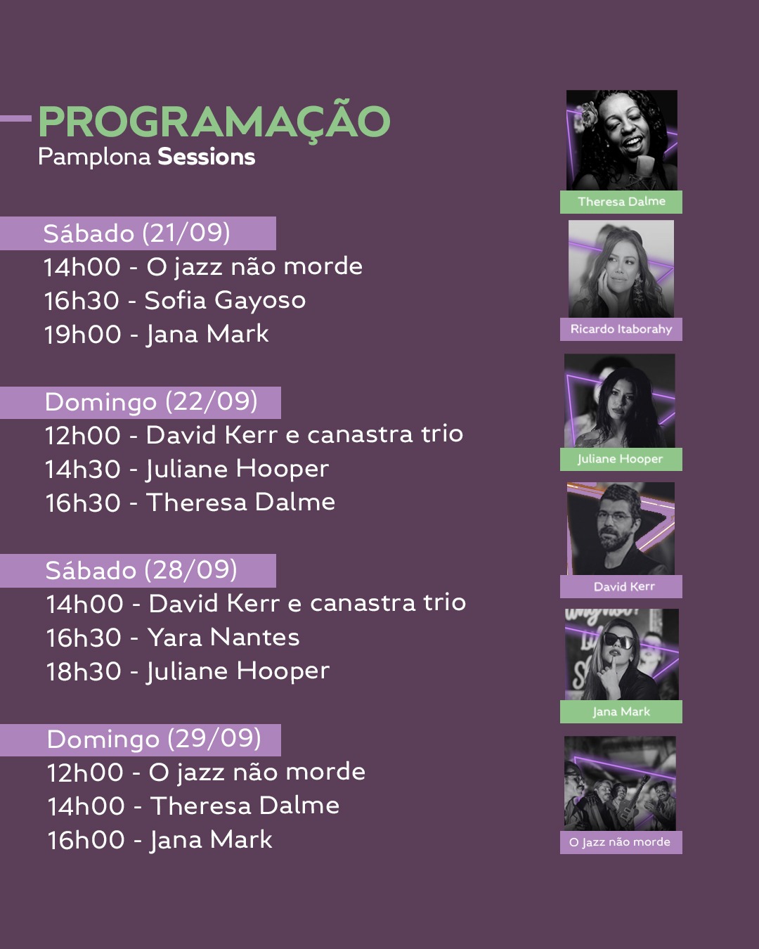 “O Pamplona Sessions reforça nosso papel como promotores da cultura e do lazer em São Paulo, trazendo ao público uma experiência única, que une boa música, vinhos excepcionais e a gastronomia. É um evento para todas as idades, com atividades para as crianças, espaço pet e uma vista incrível para o pôr do sol da cidade”, afirma Roger Teixeira, Gerente de Marketing do Jardim Pamplona.
