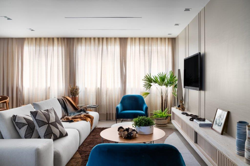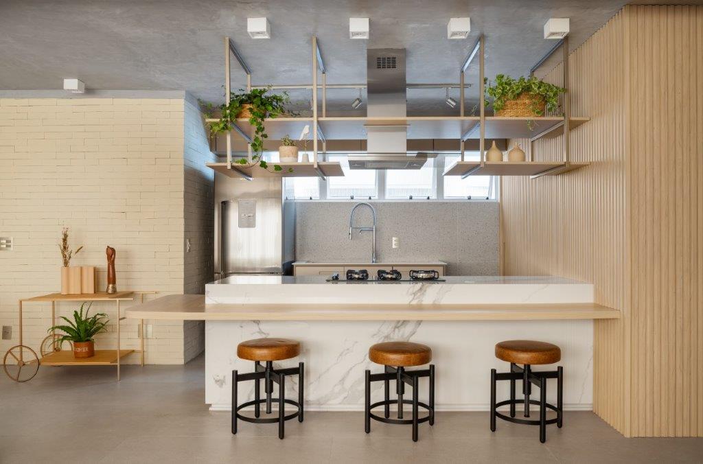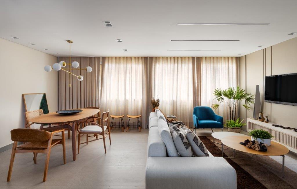 A iluminação assume o papel de maestro, conduzindo a atmosfera do lar com maestria. Spots e plafons direcionáveis proporcionam versatilidade e funcionalidade, enquanto fitas de LED banham a cozinha, os armários e a mesa do escritório em uma luz suave e convidativa. No living, um forro mais baixo recebe a iluminação indireta, criando uma área aconchegante e intimista para relaxar e apreciar um bom filme.