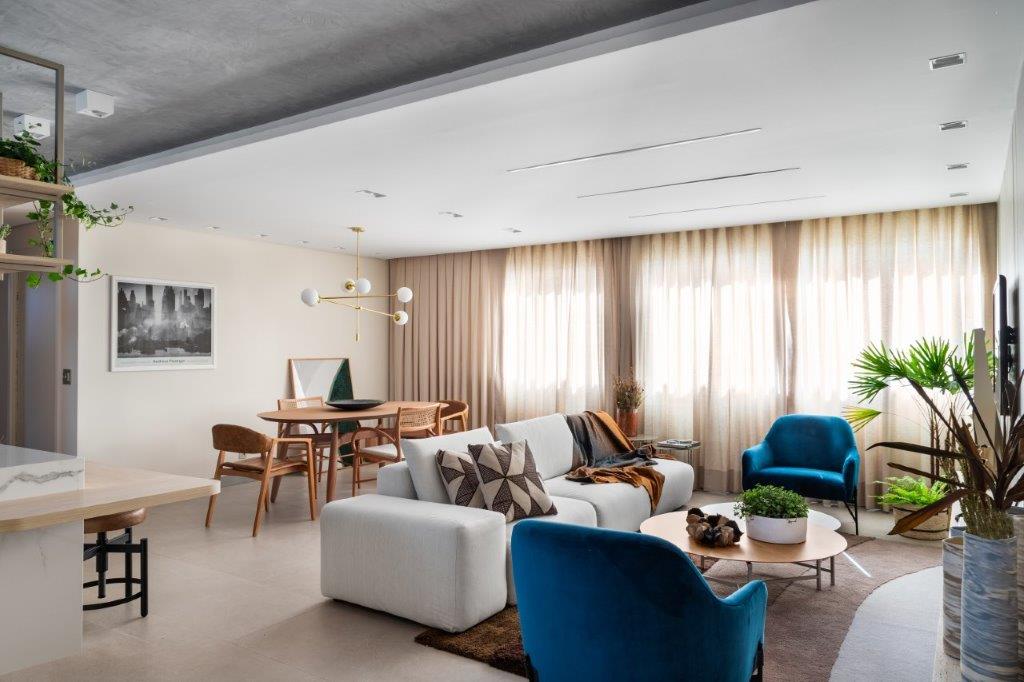 O apartamento transborda personalidade em sua mescla atemporal de estilos. Elementos contemporâneos, rústicos, clássicos, industriais e românticos se entrelaçam em um diálogo harmonioso, criando um lar que reflete a alma vibrante da sua moradora. Bancadas marmorizadas, metais black e o aconchego do amadeirado nos móveis soltos se unem em perfeita sintonia, enquanto a paleta neutra serve como pano de fundo para os contrastes marcantes e a personalidade ímpar do espaço.