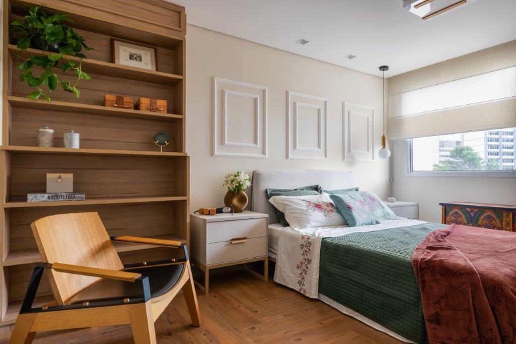 Atendendo a um desejo antigo da moradora, um closet impecável surge atrelado à sala de banho, um verdadeiro oásis de organização e sofisticação. Armários sob medida, bancadas marmorizadas e metais black se entrelaçam em uma sinfonia de elegância, enquanto o amadeirado dos móveis soltos aporta um toque de aconchego e personalidade.