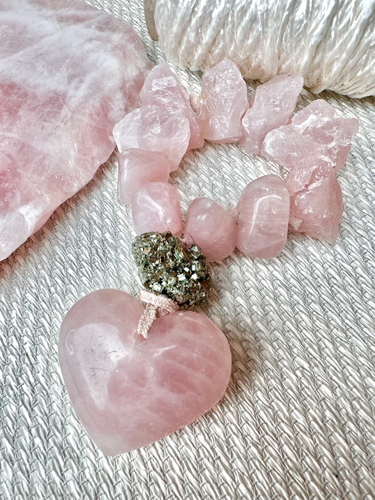 Para enfeitar o lar e trazer boas energias, a Arthi Design sugere um lindo colar de mesa composto por um coração e cristais brutos e rolados. O quartzo rosa é uma pedra conhecida por sua ligação com o amor. Mais informações: