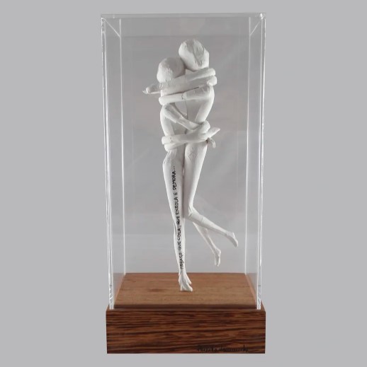 A artista Priscila Vannucchi traz lindas peças que representam a grandeza do amor e a profundidade das relações. A escultura Abraço, da série Corpo, é feita em técnica mista, com base de madeira e caixa de acrílico. Acompanha caixa expositora de madeira com frente em vidro. Dimensões: 18 cm x 13 cm x 37cm (comprimento x largura x altura).
