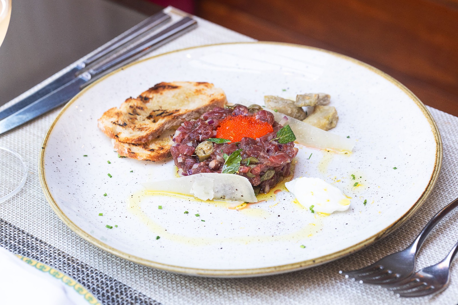 Entre as entradas, destacam-se a Pappa al pomodoro con gambero croccante, tradicional sopa toscana de tomate e pão italiano “dormido”, finalizada com camarão empanado em farinha panko; e o Crudo di agnello con carciofi e pecorino, lombo de cordeiro cortado na ponta da faca, servido com crocante de alcachofra, lascas de pecorino romano DOP, pinoli, coalhada de ovelha e ovas de peixe.