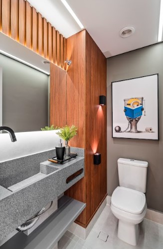 Com design contemporâneo e revestimentos texturizados, o lavabo é um espaço que surpreende, mostrando que cada detalhe do apartamento foi cuidadosamente pensado. Já a área de serviço alia funcionalidade e beleza, com armários planejados que otimizam o espaço e mantêm o estilo. Esses ambientes reforçam a coerência do projeto, que combina praticidade e estética em todos os cantos.