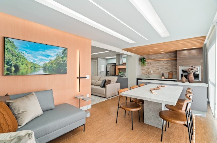 O coração do projeto é a área social. Ao entrar na sala de estar e jantar, percebe-se a integração entre os ambientes, potencializada pelas grandes janelas que deixam a luz natural fluir. O sofá espaçoso em tons neutros, adornado com almofadas vibrantes, torna o ambiente aconchegante e descontraído. A RMV Interiores trouxe um toque de ousadia ao içar a mesa de jantar de 180 kg até a varanda, criando um espaço convidativo para refeições ao ar livre e momentos de confraternização entre familiares e amigos.