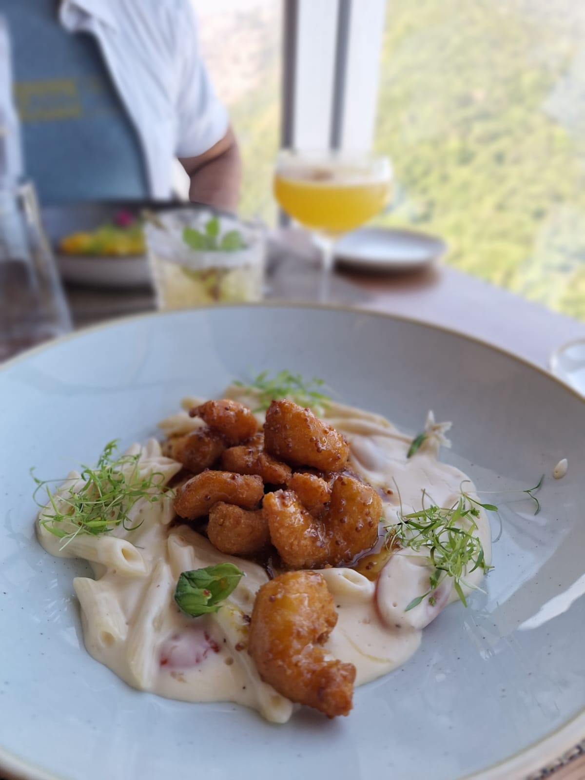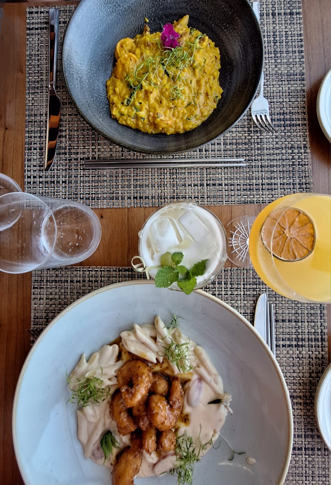 O resultado é um menu variado, com muitos frutos do mar nos pratos e também nas entradas. O risoto de polvo e açafrão e o camarão empanado com penne e mostarda Dijon foram as nossas escolhas. Acertadas!