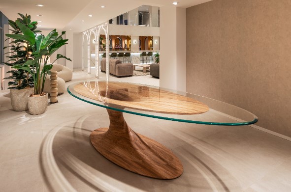 A mesa Uragano, uma verdadeira obra de arte no universo do design de mobiliário, conquistou a atenção do júri com sua abordagem única. O elemento central da peça é a sua superfície oval de vidro, que repousa sobre uma impressionante estrutura assimétrica feita em madeira de oliveira, simbolizando a tradição e a inovação incorporados nos valores da Natuzzi Italia.