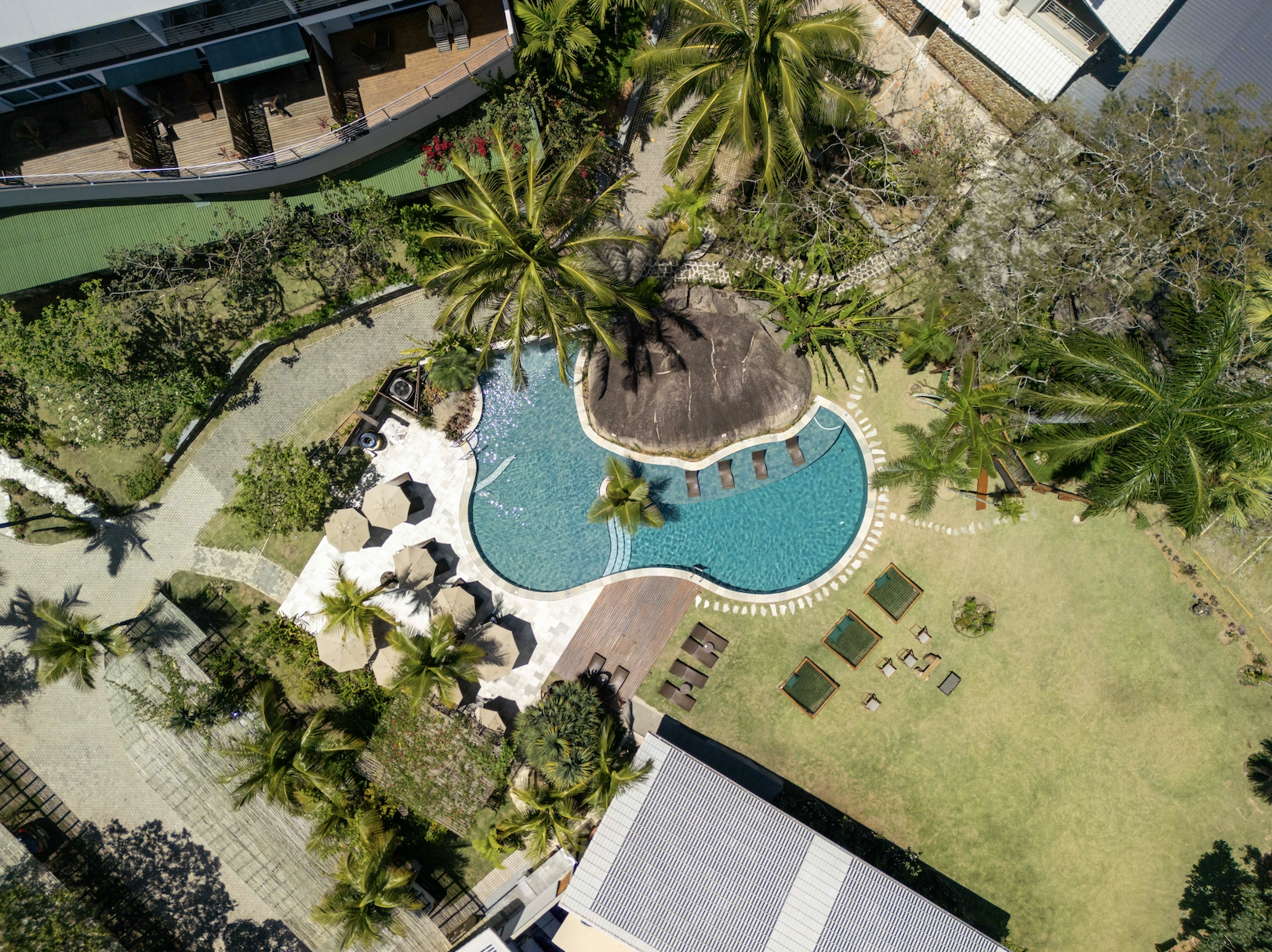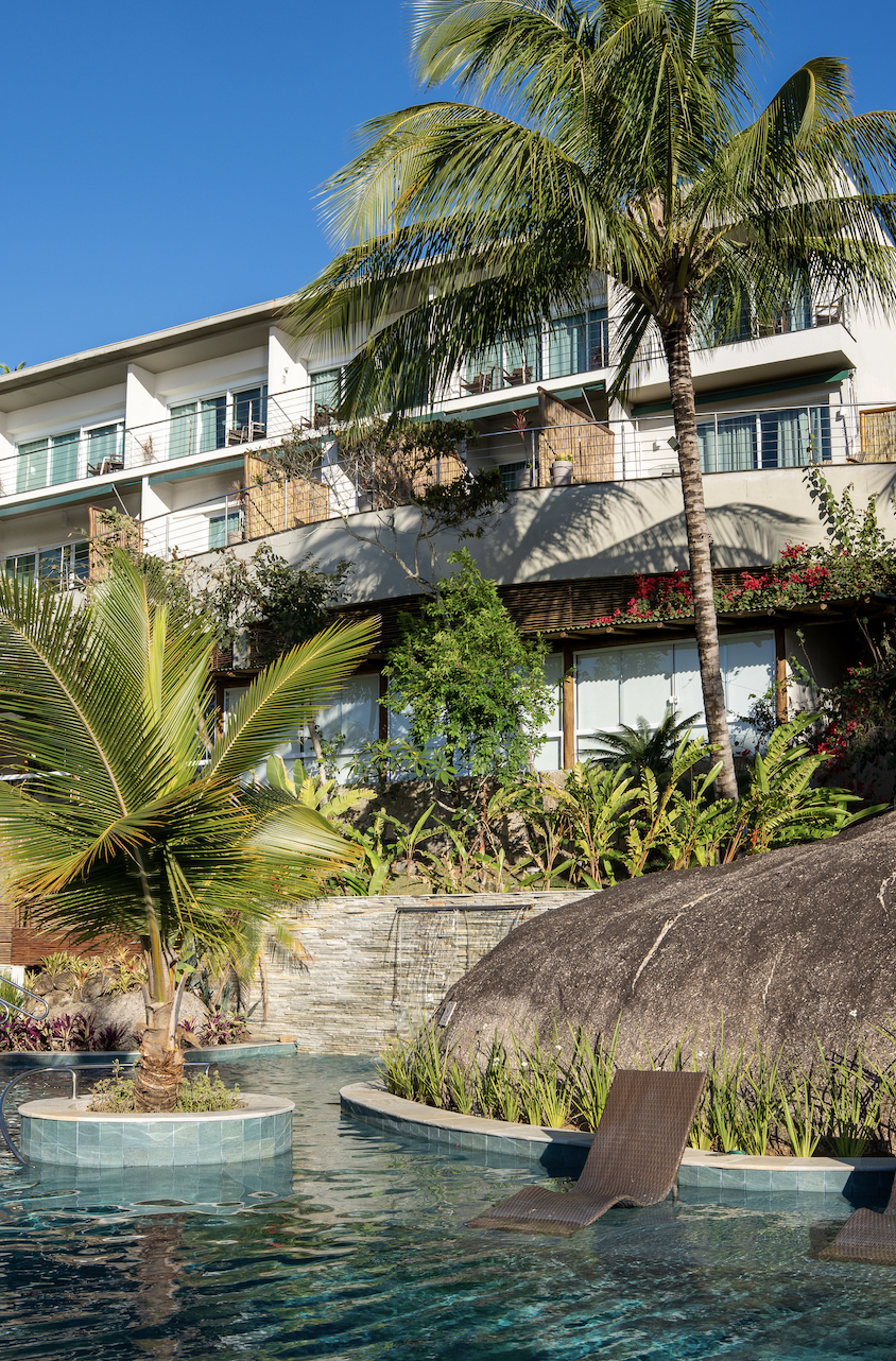 O hotel nasceu do retrofit de duas antigas casas de veraneio, projeto assinado por Ana Donadio, que preserva memória e matéria-prima: o madeiramento original reaparece no bar, no mobiliário e nos detalhes da decoração, um gesto elegante de sustentabilidade. Em uma das construções, a arquitetura se apoia sobre uma grande pedra, criando varandas que se debruçam sobre o azul. Na outra, a piscina abraça a formação rochosa, cenário perfeito para tardes sem agenda, entre coqueiros e espreguiçadeiras.