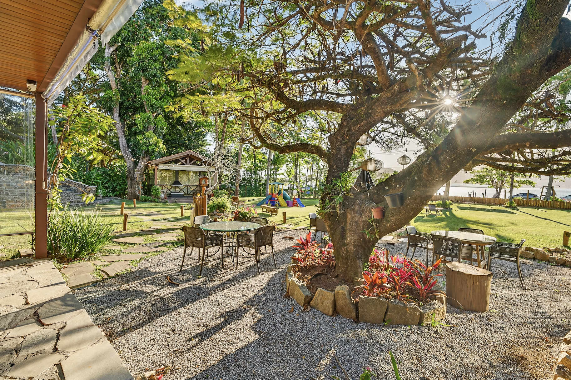 A localização soma praticidade e silêncio: ao lado do Pier do Pequeá e próxima à histórica Fazenda do Engenho, com acesso rápido aos centros comercial e histórico da ilha. Por aqui, a atmosfera é de casa de praia bem pensada — varandas amplas, brisa constante, paisagismo tropical e apartamentos espaçosos, onde madeira e tons claros reforçam a sensação de descanso. O serviço, atento sem ser invasivo, completa a experiência.