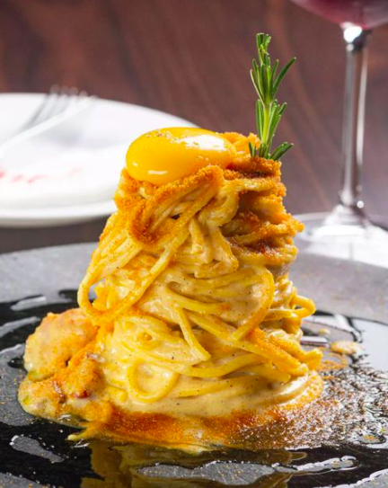 Na ala de pratos principais, Spaghetti Carbonara R$49 (Massa de grano duro servida com um creme de parmesão emulsionado com gema caipira e bacon artesanal. Finalizado com gema mole por cima) e Risotinho de Limoncello com Misto do Mar R$48.