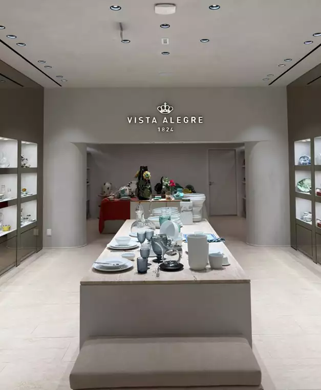 Reconhecida internacionalmente pela produção de porcelanas, cristais e artigos de design, a Vista Alegre apresenta no local um portfólio que reúne desde linhas clássicas até colaborações contemporâneas com artistas e designers. O projeto do ambiente privilegia a curadoria e a ambientação, destacando o uso dos itens em diferentes contextos, do cotidiano a ocasiões especiais.