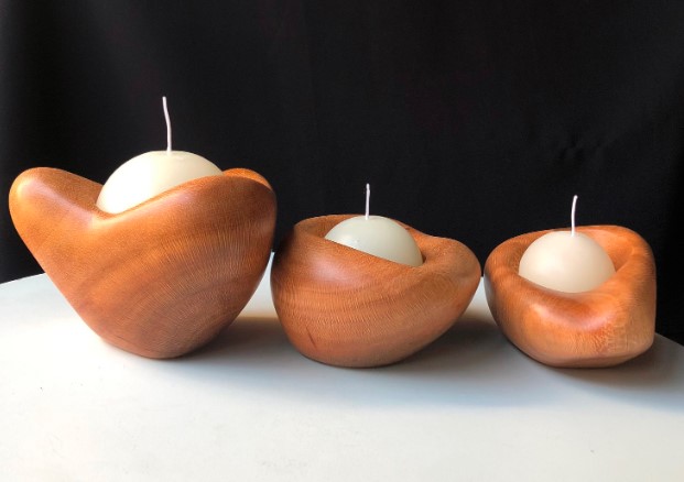 Com o intuito de utilizar as sobras e resíduos da madeira Grevilha, foi assim que surgiu a coleção de suportes para velas Pedras Roladas da artista Áurea Sacilotto. As formas são irregulares assim como as pedras roladas nos rios. Também são desiguais como a água quando cria sulco, esculpem e modelam as pedras, a madeira é torneada para receber a velas. Mais informações: www.aureasacilotto.com.br