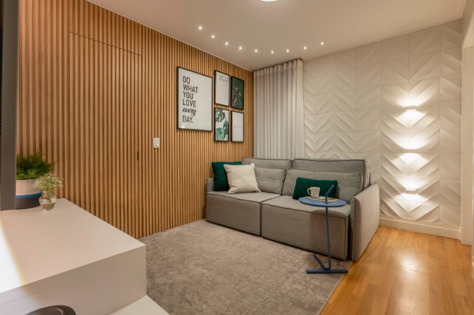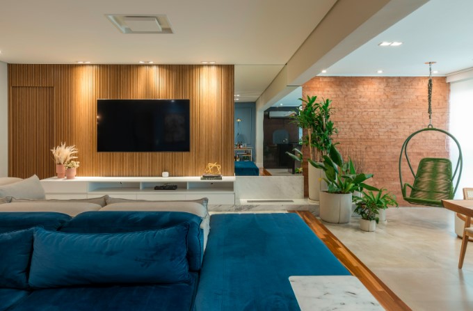 O espaço também ganhou um toque de biofilia (termo muito utilizado para designar a utilização de elementos vivos ao decor), com plantas em vasos na varanda. Elemento que promove bem-estar e alegria no bem-viver. Os efeitos de iluminação também foram elaborados para criar a sensação de conforto e aconchego nos ambientes.