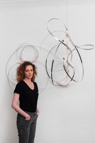 A nova exposição de Ana Holck traz uma abordagem renovada à ideia de circularidade, um tema recorrente em sua produção artística, agora enriquecido com novas camadas de significado. Embora as esculturas não sejam cinéticas, elas transmitem uma forte sensação de movimento e velocidade. Esse dinamismo é intensificado pelos jogos de luz e sombra que as obras projetam, criando formas que se expandem pelo espaço.