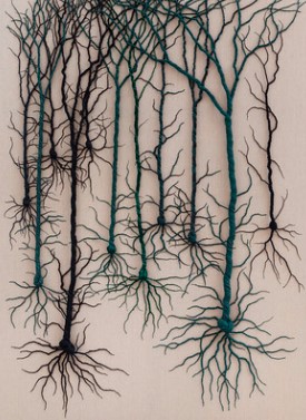 As obras são inspiradas nas pesquisas da artista sobre o trabalho do neurocientista Santiago Ramón y Cajal, considerado o pai da neurociência. No final do século 19, Cajal utilizou a técnica de Golgi para observar e desenhar detalhadamente as células cerebrais, revelando pela primeira vez os chamados “bosques neurais” – redes de células que compõem o córtex cerebral. A partir desse referencial, Janaina Mello Landini explora as conexões invisíveis presentes tanto no cérebro quanto na natureza, e se debruça sobre as complexas redes de sinapses e impulsos nervosos para criar uma série de obras que remetem às estruturas neurais e à paisagem de uma floresta.